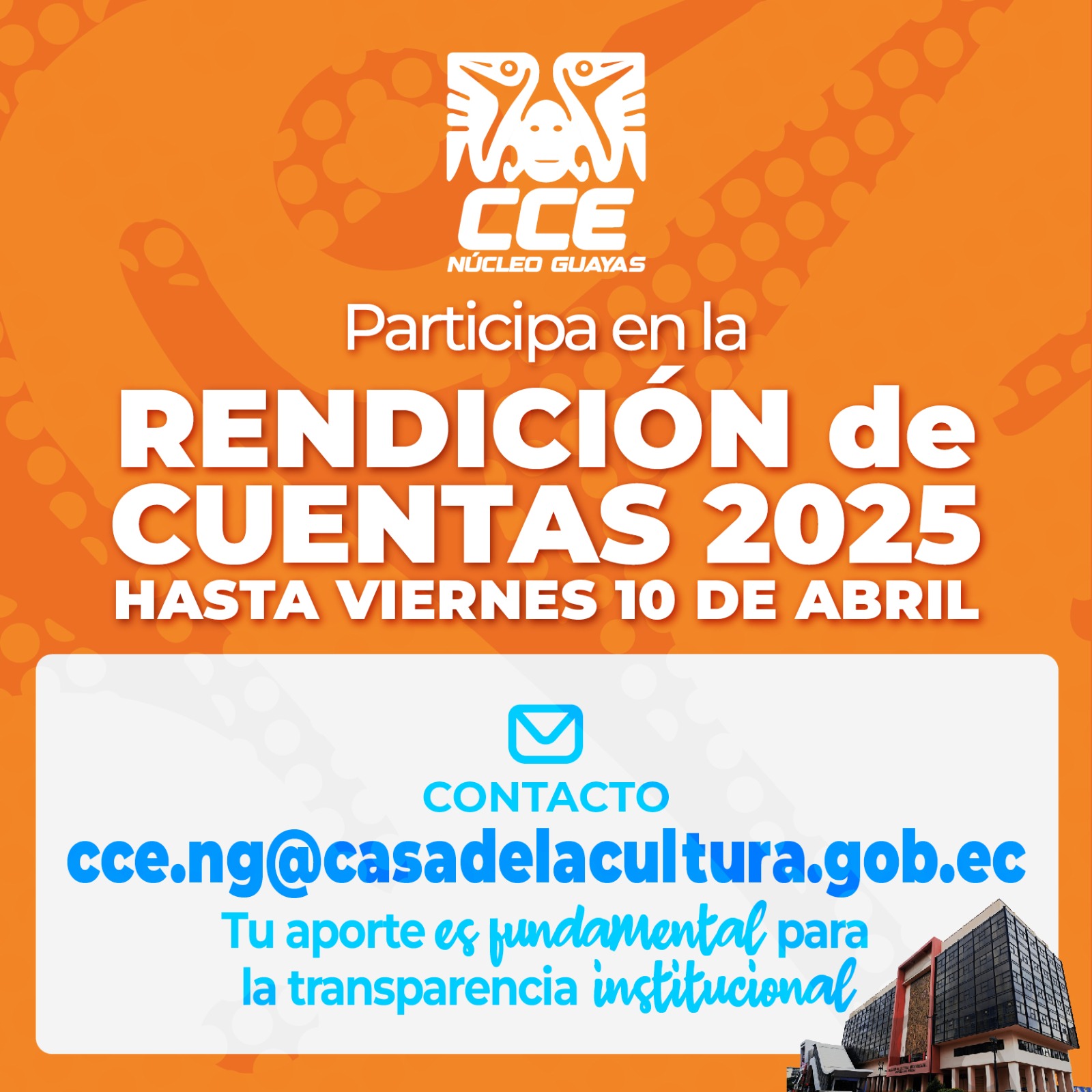 La Casa de la Cultura Ecuatoriana Núcleo del Guayas invita a sus miembros, al RUAC, artistas y gestores culturales de la provincia a ser parte activa y participativa en el proceso de 𝗥𝗲𝗻𝗱𝗶𝗰𝗶ó𝗻 𝗱𝗲 𝗖𝘂𝗲𝗻𝘁𝗮𝘀 2025.
